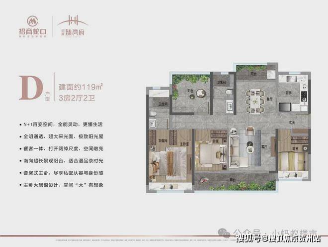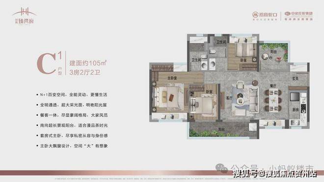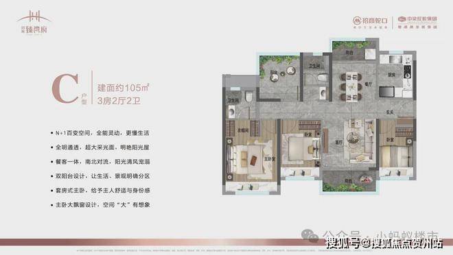105㎡3+1房:南北双阳台设计,南向6米景观阳台,主卧套房带独立衣帽间,改善升级首选。