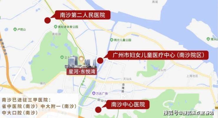 周边医院:广州市第一人民医院南沙分院、广州妇女儿童医疗中心南沙院区(在建)、中山大学附属第一南沙医院、中山大学附属南沙口腔医院(在建)等。