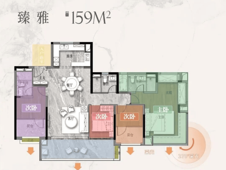 159平方米四房三卫则瞄准*改善需求,做到五开间朝南,搭配270°主卧飘窗和嵌入式衣帽间