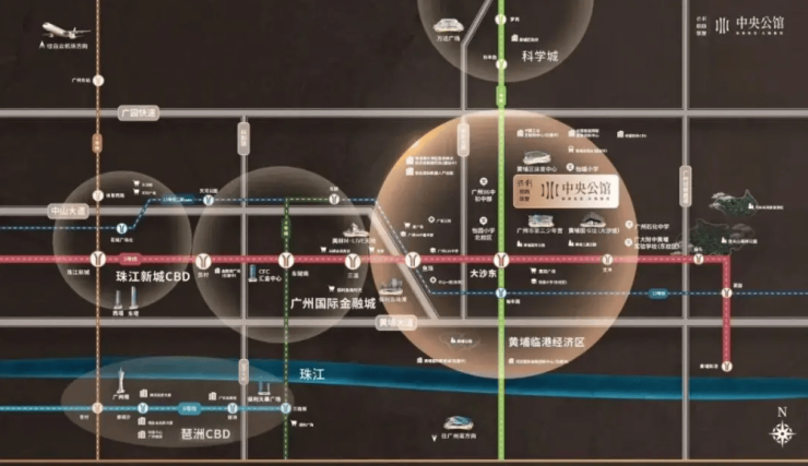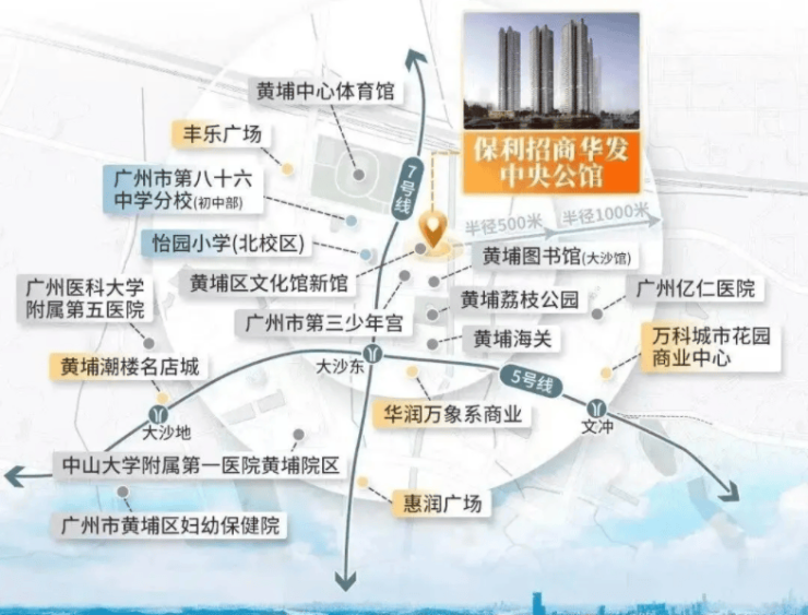 中央公馆位于黄埔区核心区域,紧邻5号线与7号线二期大沙东站,步行直线距离约550米,3站可抵达天河金融城,10站无需换乘就能直达珠江新城,日常通勤效率有实打实的保障。