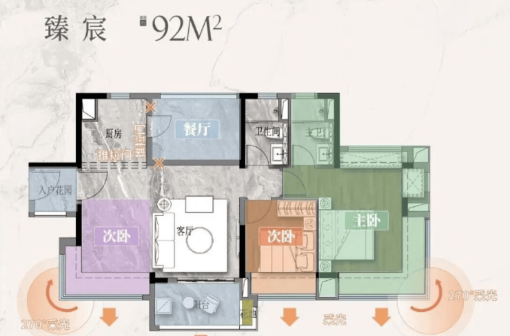 92平方米三房两卫则在空间尺度上进一步提升,公区更显开阔,适合追求舒适感的小家庭改善。