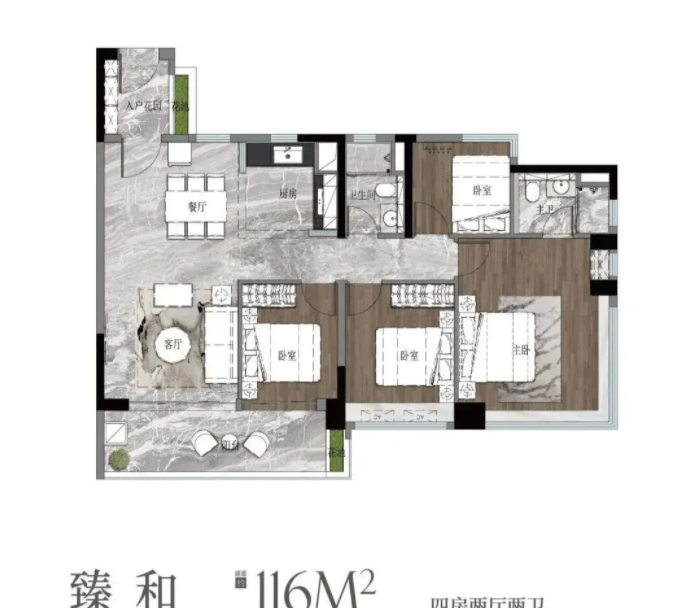 116平方米四房两卫是改善家庭的优选,采用LDKB一体化方厅设计,公区面积超60平方米,实现了“小面积大空间”的居住体验