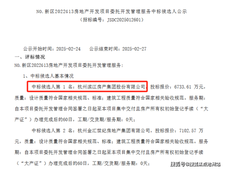 今年2月24日,南京官方网站发布“No.新区2022G13房地产开发项目委托开发管理服务中标候选人公示”,杭州滨江房产集团股份有限公司高居中标候选人第1名。