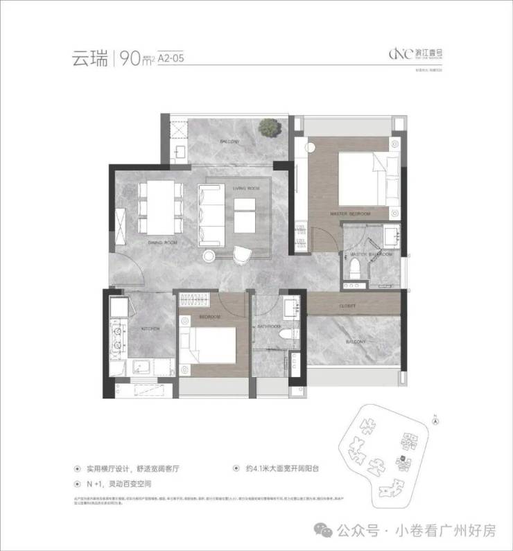 小区高层可南向直面珠江,内部有1.5万㎡景观面积,社区6000㎡的中心园林,涵盖了1个中心景观沙龙、2个下沉式庭院绿谷以及8大全龄主题园区等。