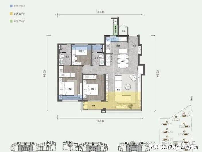 正常情况之下,建面约110多平的户型一般都是三房两卫,就算一些准四代住宅,这样的面积段户型顶多做成3+1房。