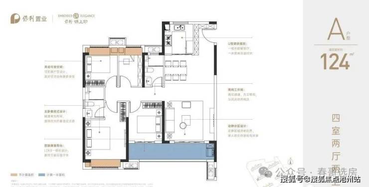 精研现代人居需求,推出的建面约124平四房两厅两卫户型,是市面上建面约140平以上产品才会做的4房设计,是目前武汉市场非常难得的优质户型。既避免了以往的140平+大户型带来的高总价,又避免了传统的三居户型后续置换困扰。