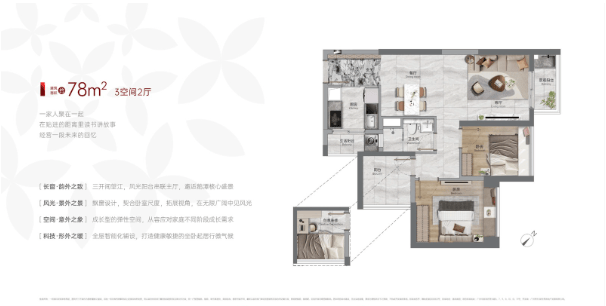 整个项目只有6栋楼,半围合式分布,45度“风车”户型联排,做到不同的户型的主要室内空间都朝南向排布,尤其卧室空间,几乎做到了100%朝南。
