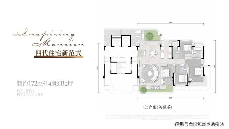 以建筑面积约172㎡偶数层户型为例,四房两厅三卫格局,以约15.9m南向面宽、4.5开间朝南的恢弘气度,构筑全明通透的朗阔空间。