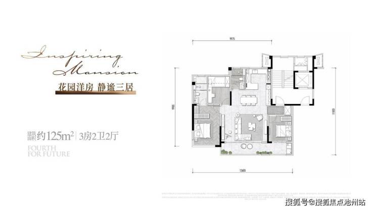 建筑面积约125㎡户型,三房两厅两卫布局,三开间朝南,整体南向面宽约12.6m。