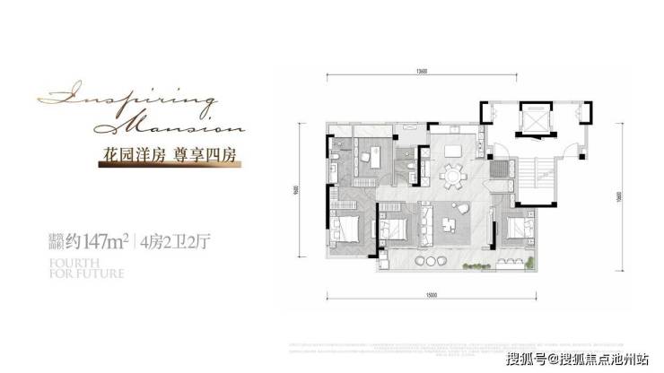 建筑面积约147㎡户型,四房两厅两卫,整体南向面宽约15m,尺度更为宽裕。