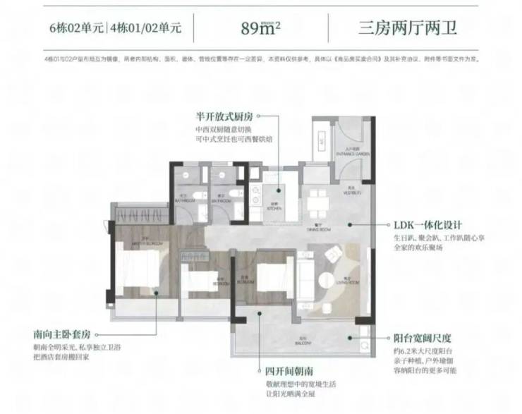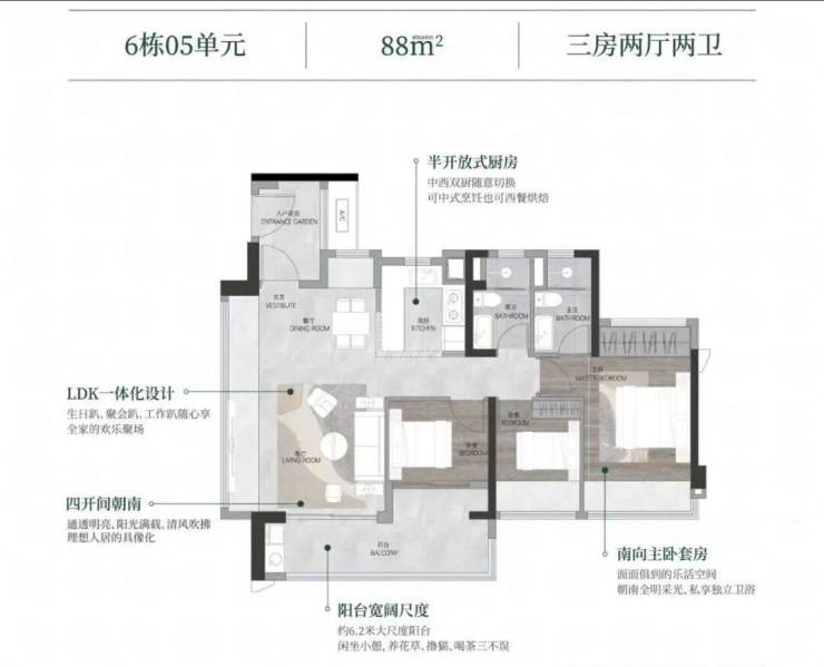 88㎡小三房:阳台居然有6.2米开间,相当于别人家120㎡的配置。最绝的是能隔出四开间朝南小户型也能享受大采光。