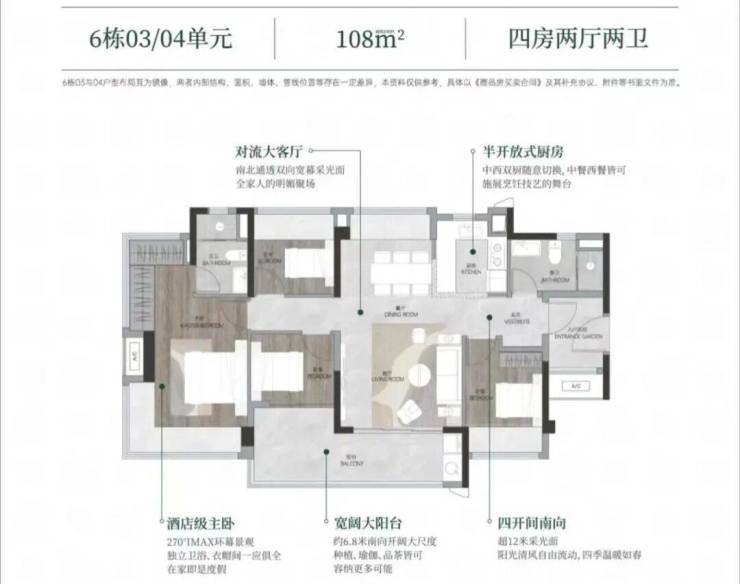 106㎡三房:6.5米阳台+入户花园,使用率超110%。按新规设计,实际使用面积比同面积旧规户型多10㎡左右。