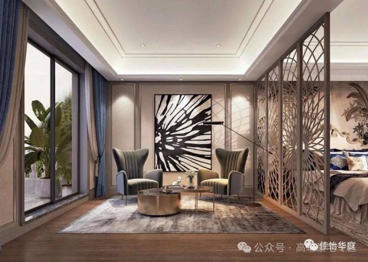 小区建筑设计以简欧风格为主,外墙干挂大理石,整体是浅米黄色调。四周采用铝合金断桥双层中空玻璃采光窗装饰和庄重石柱,为别墅的豪气程度增添色彩。样板房室内装修为轻奢和简欧混搭风格,自带高级感的设计元素彰显了住户的气质。