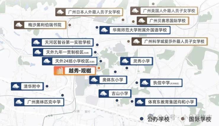 此外,项目半径约1公里内,更有着广州罕见的“双轨并行”教育密度:不仅有执信、清华附中、奥林匹克等强校,还有梅沙黑伯瑞书院、广州贝赛思国际学校、广州爱莎学校等多个国际教育资源。