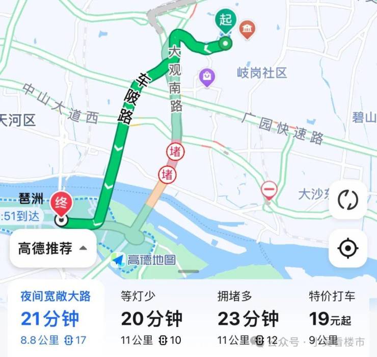 自驾去往琶洲:悦景路转到奥体路,再转车陂路,最后转新港东路,全程8.8公里,耗时21分钟左右。