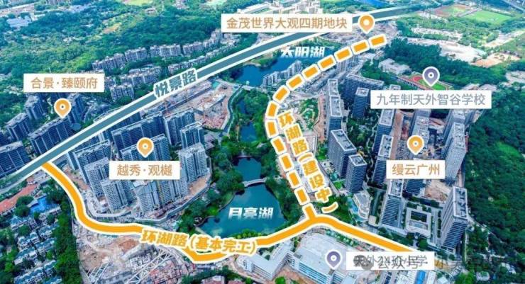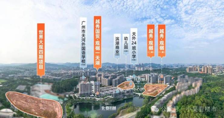 如连片发展后,世界大观坐拥天河区稀缺景观——约5.3万㎡月亮湖和太阳湖,还背靠绿化山体,即越秀·观樾依山傍水。