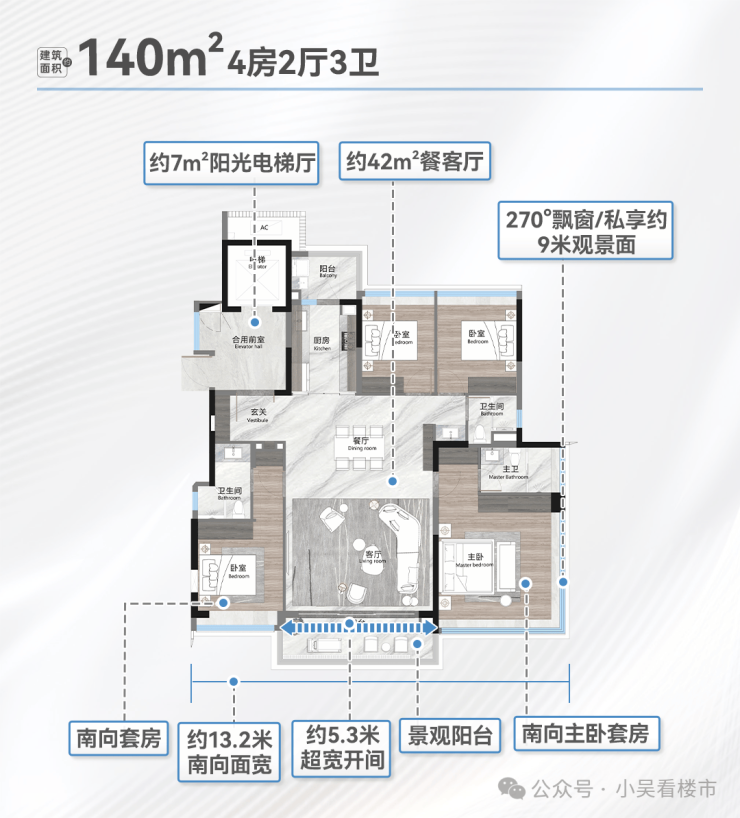 建面190平四房三卫,四开间朝南,超大玄关专梯入户,9.4米观景阳台,客厅与次卧打通的话,客厅开间也可达9.4米,超43平的主卧,270度环幕飘窗。