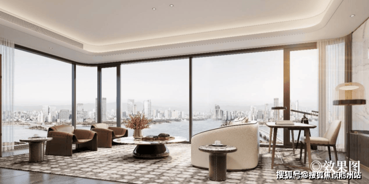402席全江景住区:每户沿江面均配置全景落地Low-E玻璃幕墙,约7.4-9米的瞰江横厅、“双全景舱”等创新设计,实现270°无界江域视野。