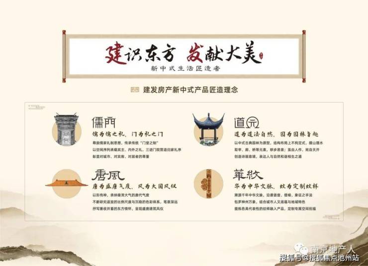 建发房产聚焦高端产品锻造,打造让国人有归属感的、有文化与情怀的好房子。通过“儒门、道园、唐风、华纹”匠造理念,用现代的材料与工艺,传承中国传统建筑文化的精髓。目前已经成为地产行业IP。无论是极有辨识度的威仪大门,还是集萃东方大成的园林,建发房产已成为目前国内为数不多的新中式产品缔造者。