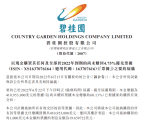如今,上述要约回购迎来新进展。据碧桂园6月23日早间公告,对“XS1637076164/163707616”的要约回购事宜已于2022年6月22日下午四时正(伦敦时间)届满。截至届满期限,投资人根据要约,自愿交回了本金总额4.10亿美元的票据,占尚未赎回票据本金总额的约60.13%。