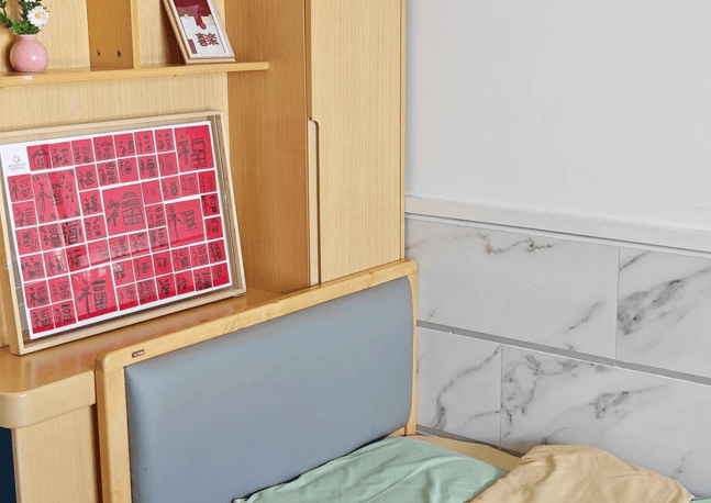 居住空间分为单人间(35-45㎡)、双人间(28-35㎡)、三人间(20-25㎡)三类。所有房型均采用无障碍设计:防滑地胶覆盖率100%,卫生间配备坐便助力架与紧急呼叫系统,毫米波雷达跌倒监测系统实现24小时动态监护。单人间部分房型设有独立庭院,双人间采用分体式床头柜设计,三人间通过模块化家具优化空间利用率。