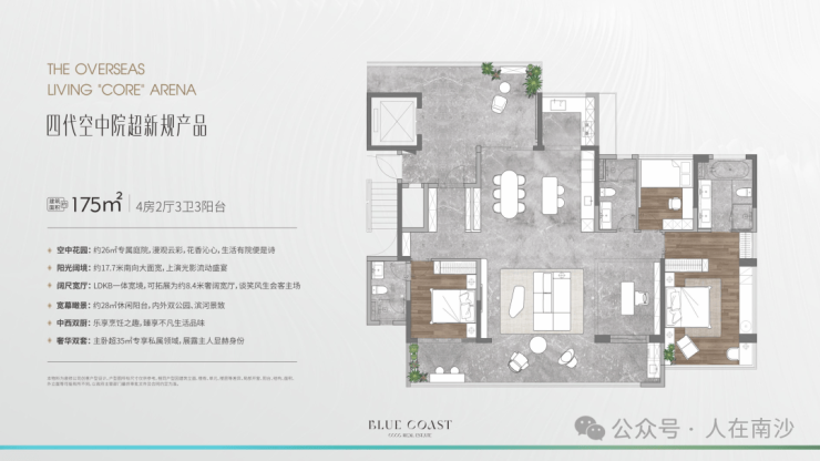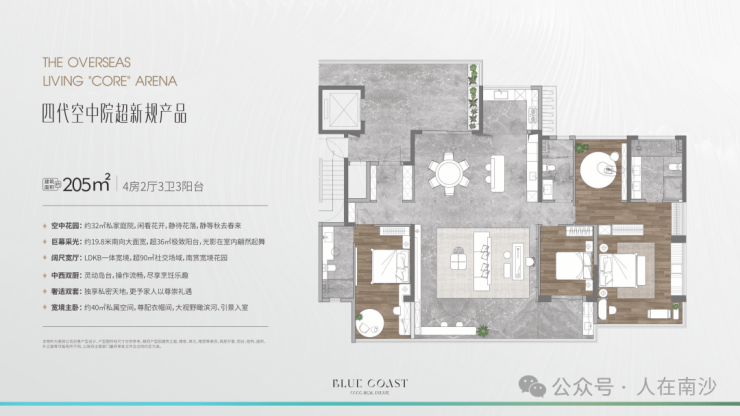首期地块总建面约9.2万㎡,包括10栋16层住宅+2栋11层住宅。整个楼盘比起之前刚开始的时候已经进行了大调整,其中最大的亮点就是降低了容积率和楼栋高度。项目的容积率仅有1.57,全盘均为11-17层的小高层,且为纯板式设计,专梯专户。户型也是面向高端,户型已经升级为为四代空中院超新规产品,户户私享空中庭院,约30%的阳台占比,使用率约130%!首期共有5个户型,为建面约132-164-169-175-205㎡三至四房。