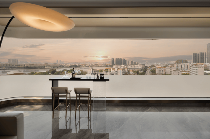 西派粤府采用围合式布局,前后有高度错位,能保障大部分户型能够看到旁边的江景。