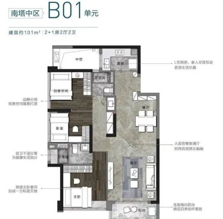 建面约101平2+1房,超大的餐客厅,联通南向大阳台,让你踏入的第一眼就能感受到大宅风范。而且户型设计了不少收纳空间,加上干湿分离的卫浴设计,引领全新时代的居住习惯。