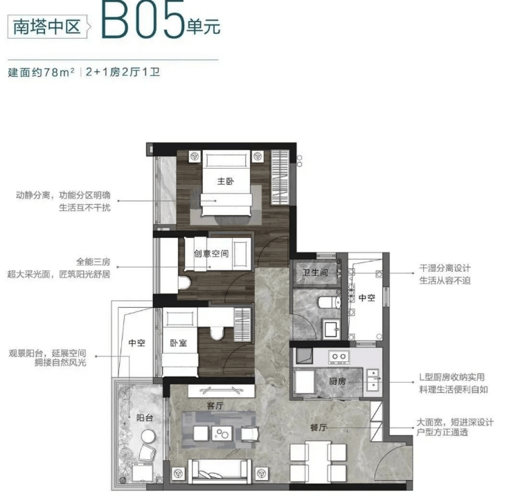 建面约78平2+1房,客厅、卧室一字排开,拥有超大采光面,将阳光、清风尽情纳入屋内。