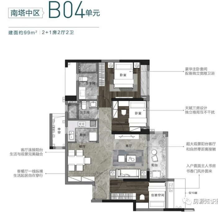 建面约99平2+1房,方正通透,足够多口之家同堂生活。户型带有豪华主套,拥有独立的卫浴,私密感更强,即使是出门前的“早高峰”也无需和家人产生使用冲突。还能在宽景阳台上摆上户外桌椅,沏上一壶清茶,享受难得的悠闲时光