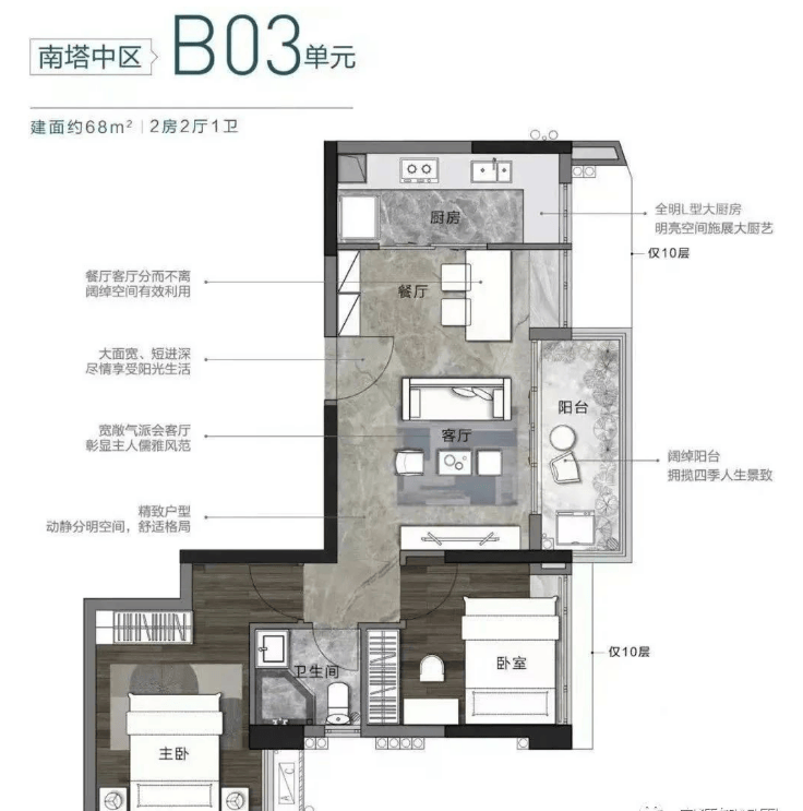 就目前流出的户型图来看,建面约68㎡两房两厅,采用横厅设计,动静分区明显