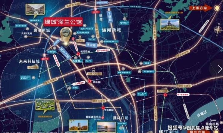 绿城深兰公馆位于杭州余杭区博园路与棕榈路交叉口东南侧,处于良渚新城核心区域,是杭州六大副中心之一。良渚新城定位为中央活力区(CAZ),集商务行政、休闲娱乐、文化交流、旅游观光、品质住区为一体。政府千亿级规划大力赋能,未来将持续承接数字经济、文化创意等产业的导入。近年来,良渚新城在基础设施建设、公共服务配套完善等方面不断发力,区域价值正处于持续跃升阶段。项目紧邻杭州勾庄十大农贸批发市场,包括果品、蔬菜、五丰冷冻食品、粮油、五和肉类、水产、调味品、茶叶等。这些市场工商登记营业执照达 26000 本,经营户 6000 + ,年营业额 700 余亿,市场内从业人员 16000 余人,日均人流量高达 20 万人次 。如此庞大的产业规模和人流量,带来了旺盛的居住和办公租赁需求。同时,良渚新城还有数字经济产业园等产业园区,吸引了大量高净值白领人群,进一步夯实了区域的租赁市场基础。