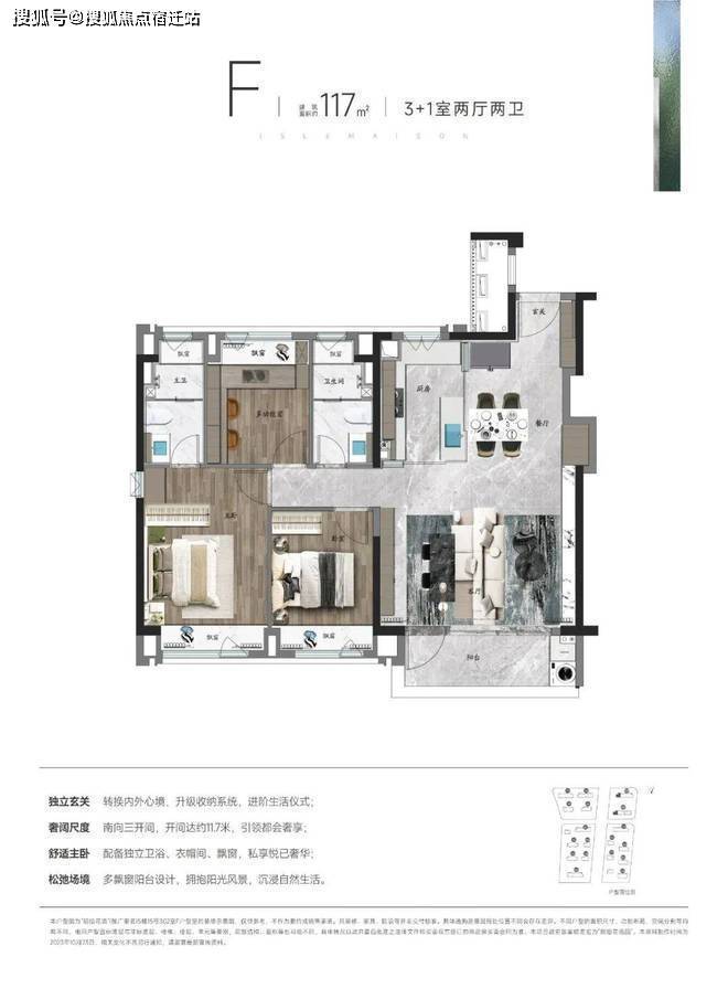 约117-133㎡3-3+1的户型,四开间朝南,巨大的南向采光面让室内的每一处都盛满阳光,这个尺度感相当出众。另外,客厅的灵动空间可以用作瑜伽房或者是孩子的游乐天地,实用性很强。