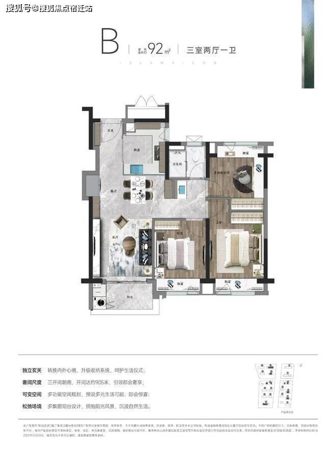 建面约92㎡的3房B户型,整体三开间朝南,3卧室2飘窗1阳台,并且室内没有过多的转角和过道浪费空间,所以不管是采光、视野、通风还是尺度感都可圈可点。