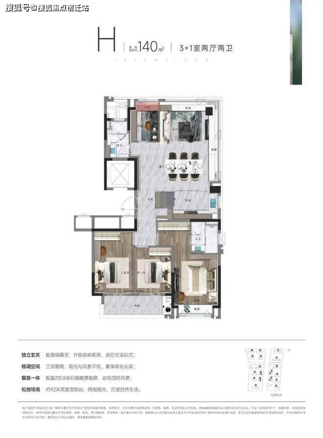 约140㎡3+1房,拥有一个约270度的转角厅,视野出众。