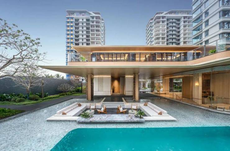 汲取热带隐奢度假胜地建筑灵感,以潮汐之韵律与游艇之优雅为灵感,打造优雅曲线的建筑立面设计,塑造向海而居的松弛惬意。