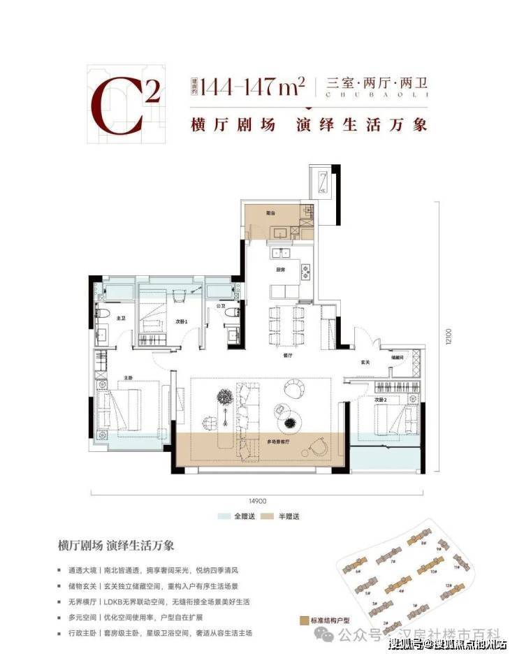 该户型位于1、6、8号楼及 12 号楼的边户,有独立的入户电梯厅,三开间朝南,入户门口新增了一个小型储物空间,且南北双阳台布局,增加了房间的通透性,全屋赠送面积很大,120m²左右可以满足刚需改善型的需求。