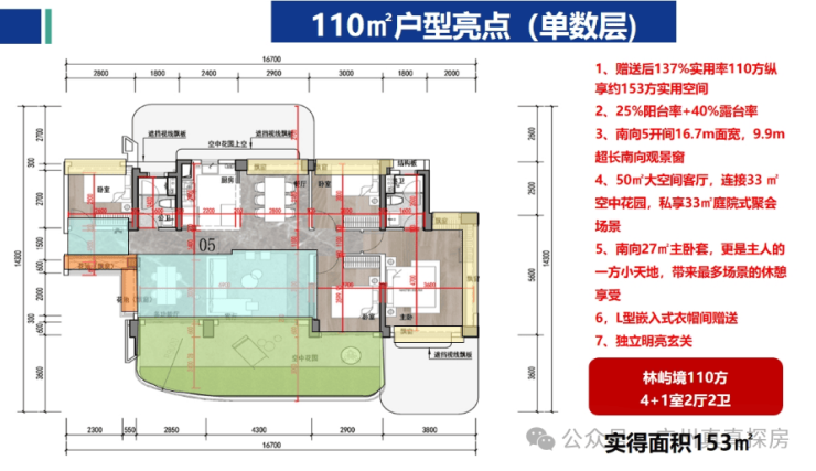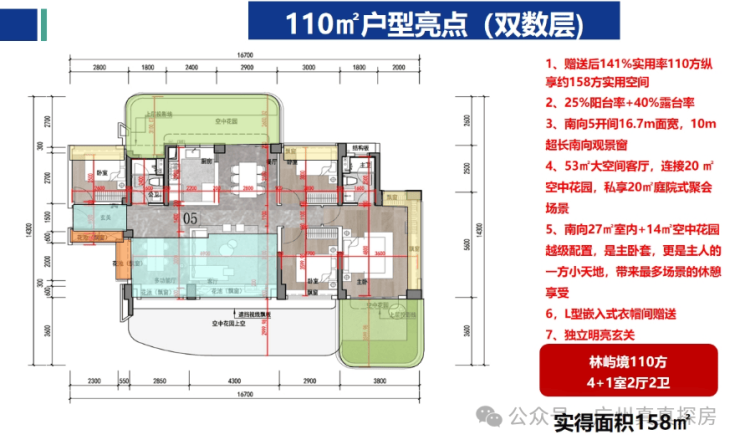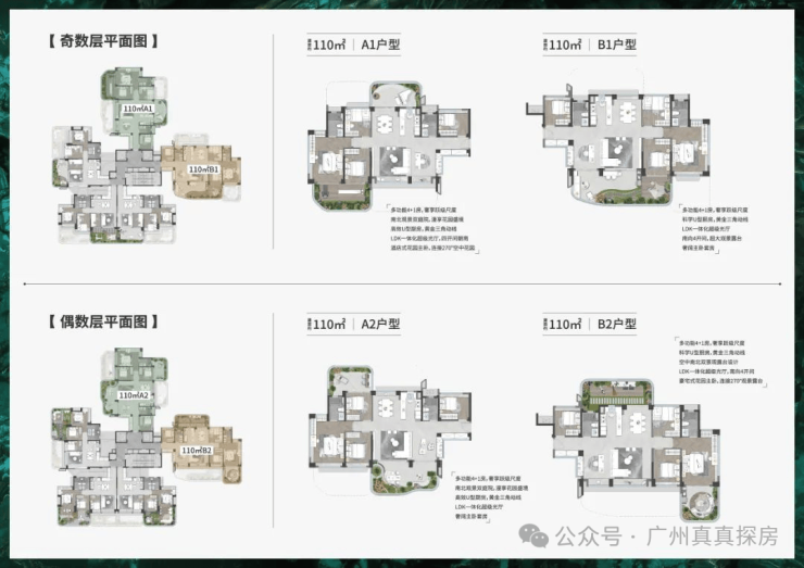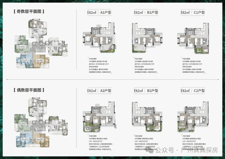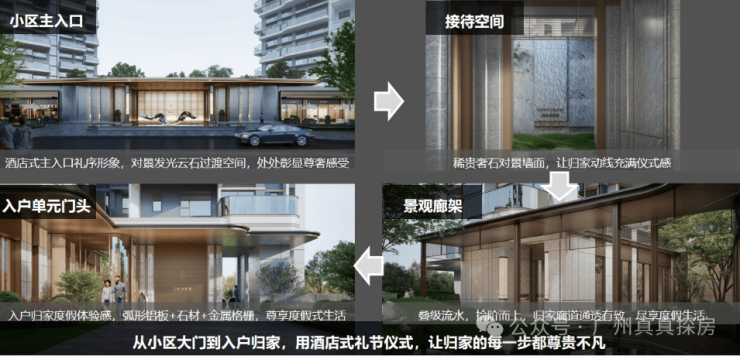 小区配套:提取漂浮岛屿的灵感元素,将外部花园街区及内部立体多维景观相结合,打造纯林自然的轻奢度假感园林景观, 以“花园街区、浮屿森庭”的景观主题、“一带一芯六境”的设计布局打造“度假式”轻奢园林