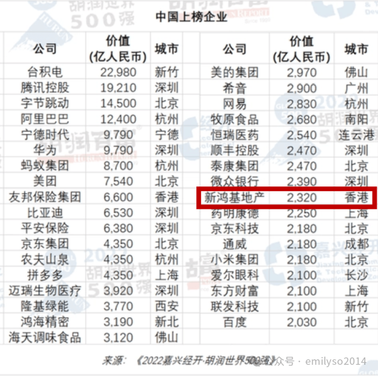 2022年胡润世界500强榜单中,全球仅7家房地产企业上榜,其中中国只有新鸿基地产一家,成为价值最高房企。