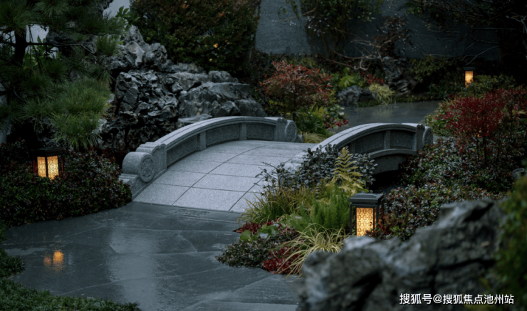 三进仙桥绿堤,观游园拾趣之礼。穿过古朴石门,于幽径中行走,一花一木,叠石理水,自然安逸,营造人在画中游的体验,让居者的归家之旅既显荣耀,也有诗意享受。