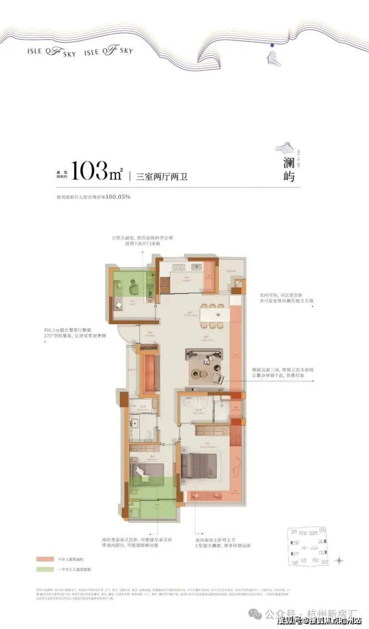 建面约103㎡明星边套户型,是目前市面上实用率最高的三房格局,得房率高达100%,绝对的“0公摊”,主卧竟然设计270°转角飘窗,通常只在市中心千万级豪宅中才会看到,是全杭州小户型中的唯一级了。