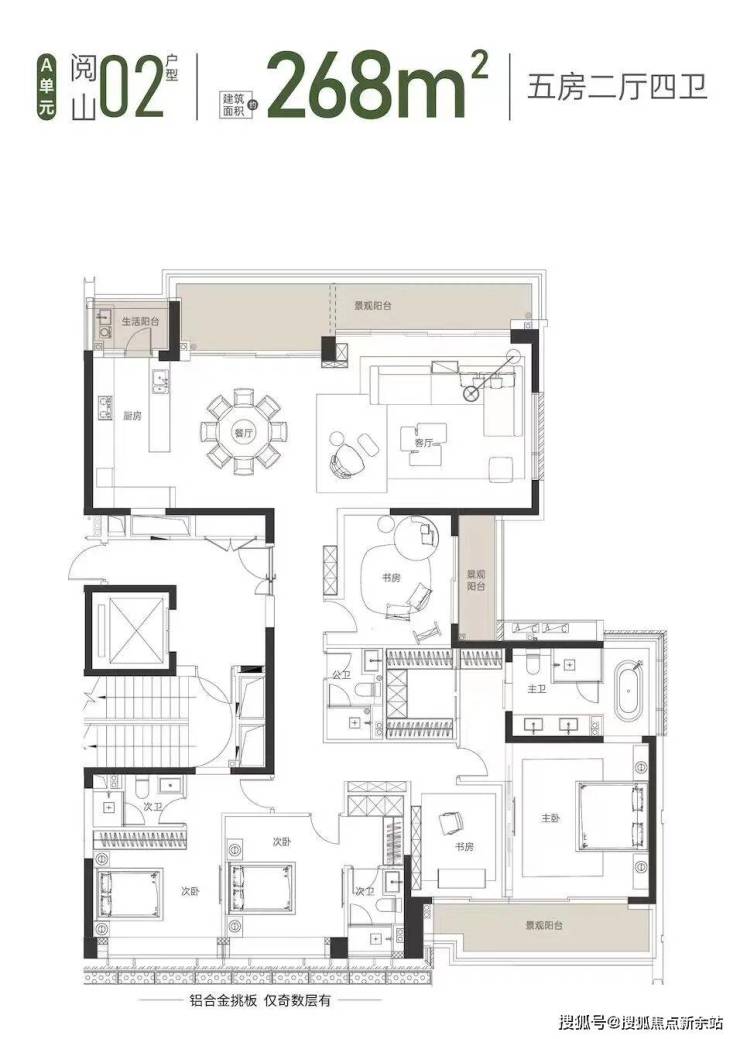 同样的专梯入户,豪宅感扑面而来,该户型为顶级大户型,四阳台设计,最大有10.55米的景观阳台和180度视野的餐客厅空间奢阔气场尽显,罕见的南北瞰景四阳台设计,让家的每个角落都能欣赏美丽的山景和城市景观。所有的开窗面都尽可能放大,客餐厅、书房、卧室、几乎都能享受超宽超大屏