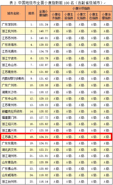 中国地级市全面小康指数前100名表单中,镇江排第18位!