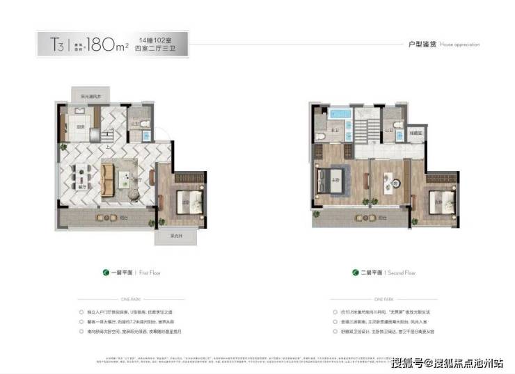 下叠主力户型约180㎡四房三卫,大面积落地玻璃,户型窗墙比超60%,通透敞亮;每户均带南向庭院(约50-60㎡,部分可达100㎡),并创意性做了地下空间。