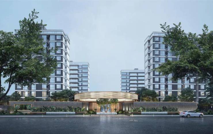 项目采用简约大气的现代主义风,强调简洁挺拔感,以灰色+浅米白色真石漆为主色调,并辅以大面积浅蓝色LOW-E玻璃构成,塑造出钻石光感的立面效果。