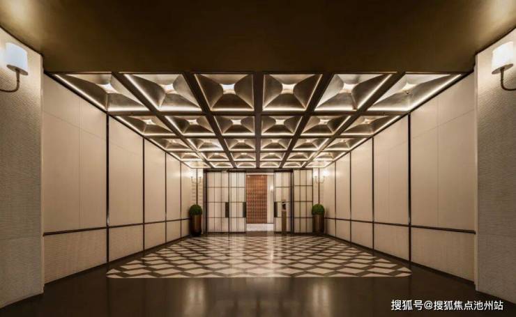 步入门庭,云石吊顶之下,借鉴中国古代建筑中的“藻井”做法,由522片皇家白玉石材拼接而成,凝聚光华,辉映时空。华光之下,中心水池承托起艺术雕塑,莹润皎洁,宛若珍宝。立面则采用铂金钻奢石,搭配墨绿荷塘月色奢石、安哥拉黑奢石花钵、以及手工锻造的巨幅铜门,流淌出一抹温润质感。