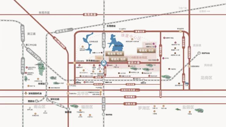 约1公里达迎宾高速,直上梅观,约40分钟畅达福田CBD;10分钟东莞南站,一站深圳,500m东莞地铁R1线环市路站地铁口、湖景路站(规划中),与深圳22号地铁线接驳,3站到观澜,通达深圳福田;R4线(规划中)、15号线(规划中)和16号线(规划中);