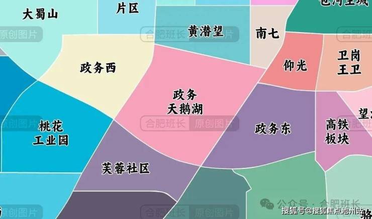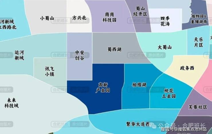 高新区有蜀西湖、柏堰湖(北雁湖)、中安创谷(方兴西)、讯飞小镇、未来科技城、南岗科技园、方兴北、高新产业园、大蜀山、天乐(科大高新)和政务西等板块。
