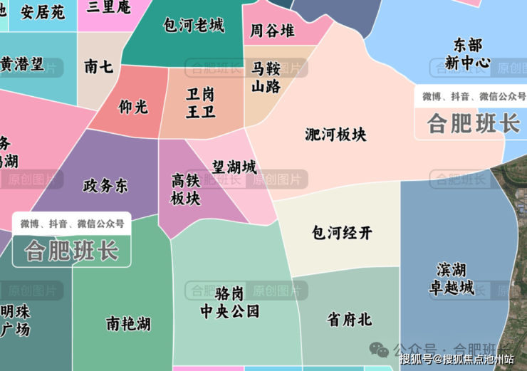 庐阳区有四里河、橡树湾、苏宜、北部新中心、大杨、大房郢、董铺湖科学岛、大科学装置集中区和三十岗等板块。