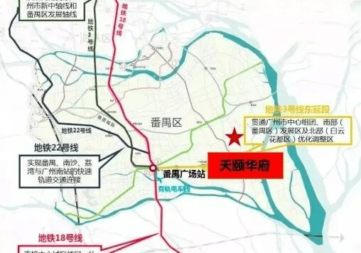 四地铁:地铁3号线,18号线(预计今年通车)、22号线(预计今年通车)、17号线(在建)番禺广场交汇站